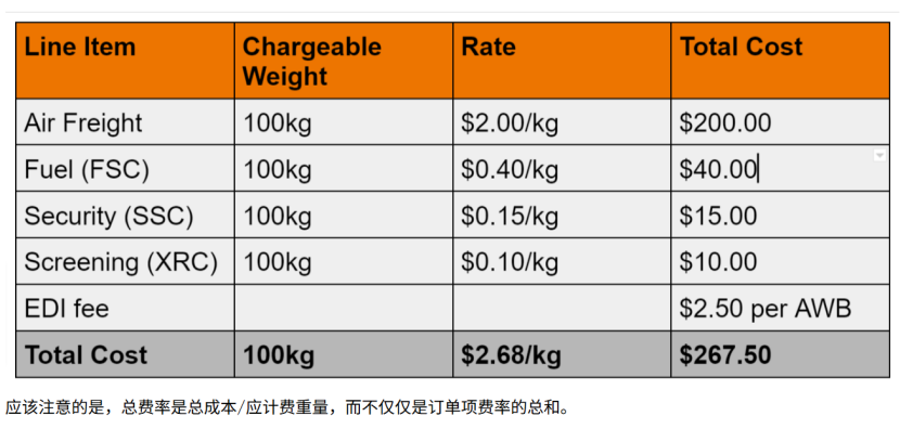 总费用成本=(空运费率 + 附加费率)×计费重量+固定附加费