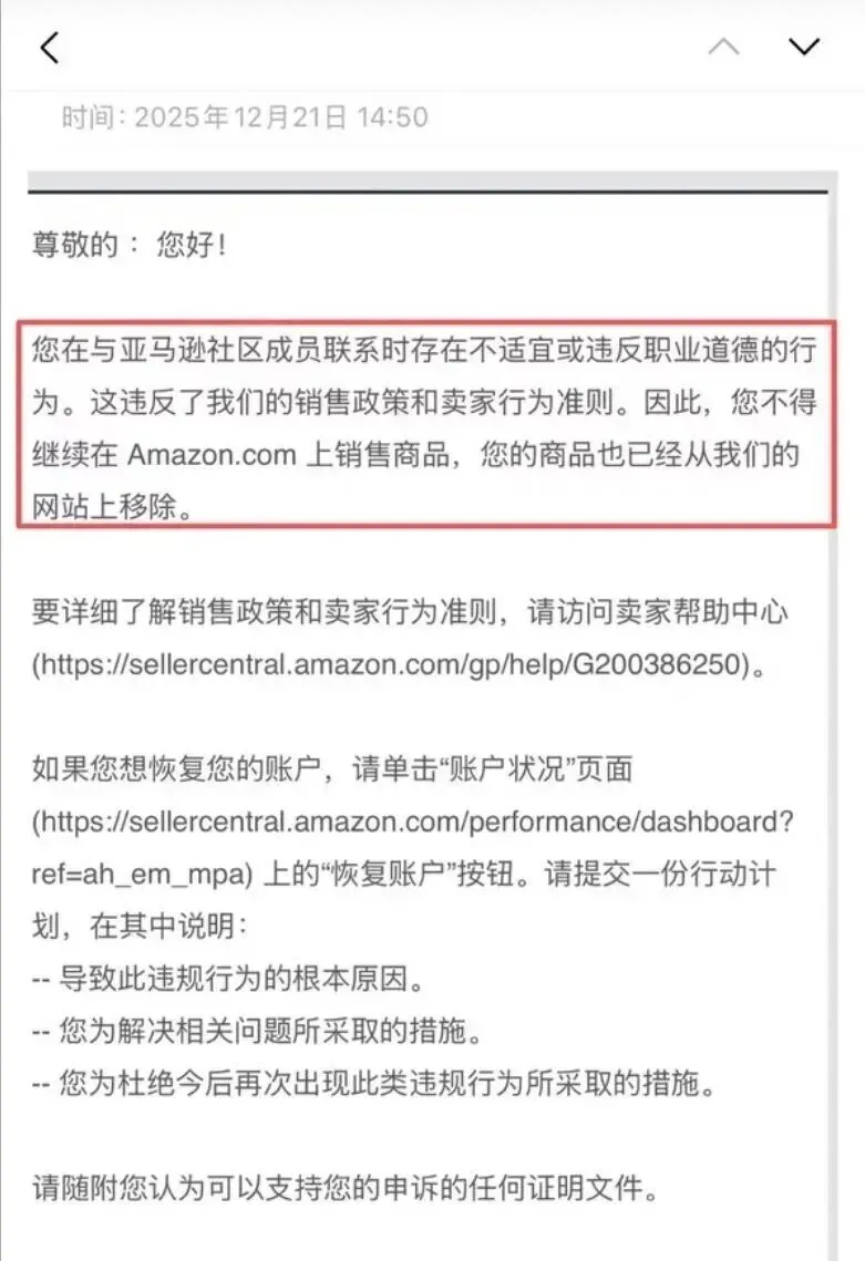 12月份底,部分卖家反馈收到亚马逊的封店邮件。其邮件中显示:您在与亚马逊社区成员联系时存在不适宜或违反职业道德的行为。
