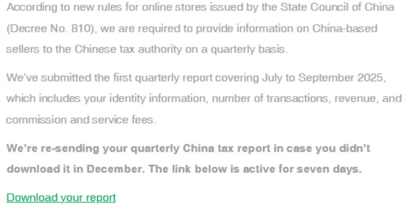 需要说明的是,收到平台邮件,并不等同于一定会被追缴或增加税务负担。但有一点已经比较明确,平台销售数据已被报送,税务机关可以掌握相关经营情况。