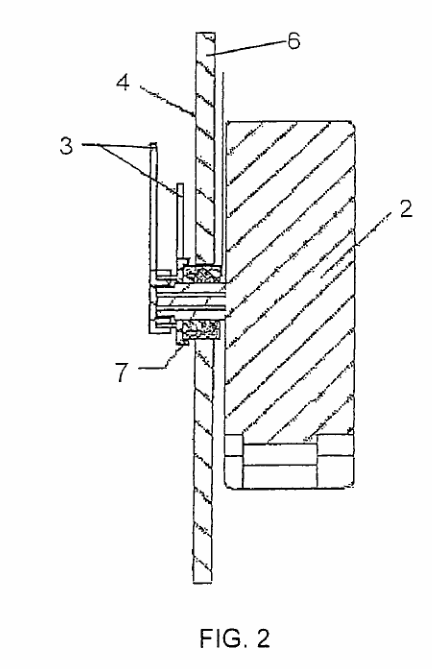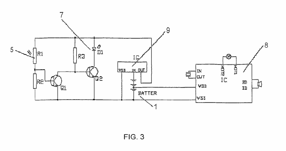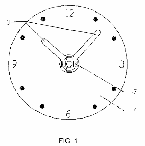 图1到图3说明了具有智能背光装置的时钟的本发明实施例。本实施例是一种模拟时钟,包括:机壳、电源1、印刷电路板、时间设置按钮、时钟机芯2、时钟指针3、时钟表面4、光敏电阻5、扩散板6、发光二极管7等。发光二极管的光线有效地折射在扩散板上,提供均匀的光线,通过时钟表面的透明部分发射,照亮时钟表面上的数字和图形。时钟指针也是由透明的扩散塑料薄膜制成,它们有效地折射光线。