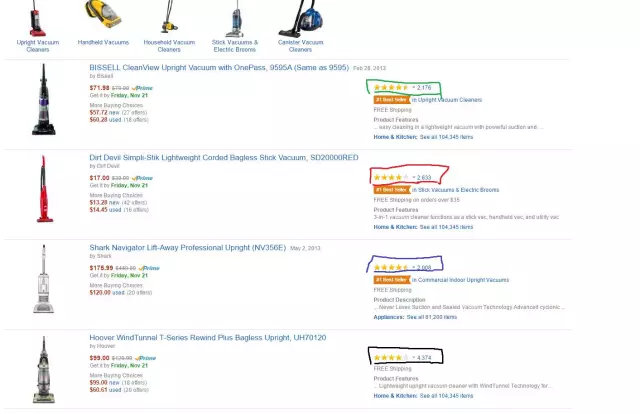 2. 排名第二的Dirt Devil(红)有更多的评论数,但是评分较低,它也是Best-Seller, 因此排名第二。