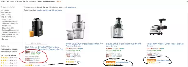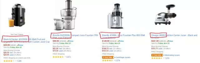 注意搜索关键词“juicer”,排名第一的产品,评论数比后面的更少,在排名前四的产品里,它评分更低,销量排名更低。它仍然排在第一位,因为它的评分较好,而价格比同类目平均价格低得多。
