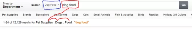 你可以看到,搜索“dog food”时,实际上进入了亚马逊的三级类目。如图中红线标注所示。蓝线显示,我们将停留在Dog Food类目,除非我们回到主页或者手动进入全类目搜索。