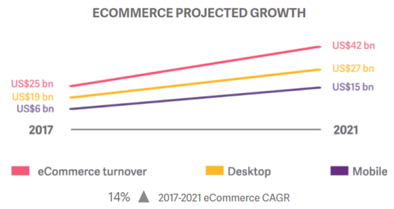 跟荷兰一样,意大利电商年增长率也是14%,今年销售额大约210亿欧元,预计到2021年将突破360亿欧元。Worldpay称,2016年,意大利移动电商在总电商销售额中的比例从12%增长到17%。过去5年互联网普及率提高了14%,有助于进一步推动电商增长。