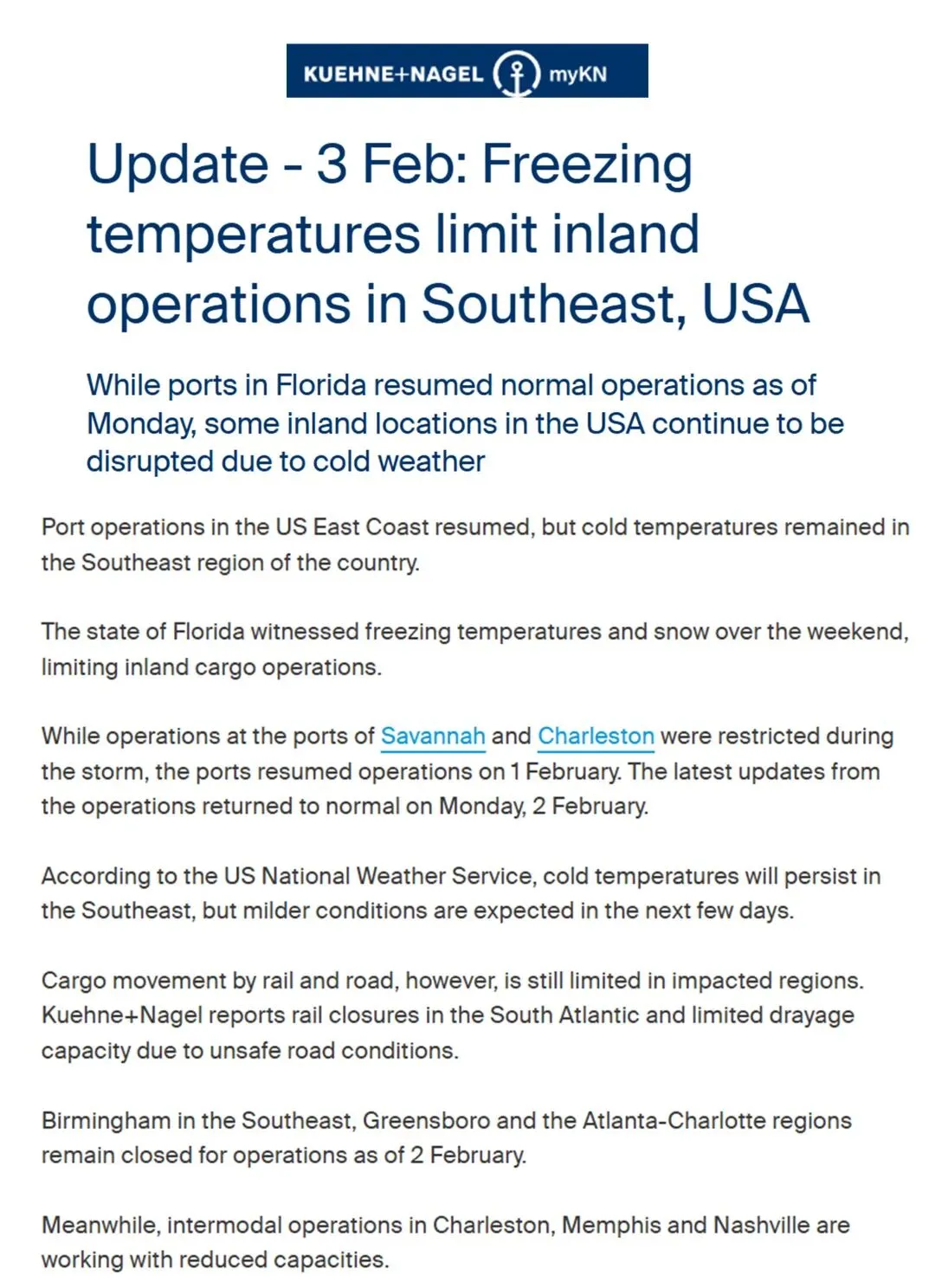 内陆端:亚特兰大、夏洛特、伯明翰、格林斯伯勒等物流枢纽的铁路/公路运输目前仍处于暂停状态。