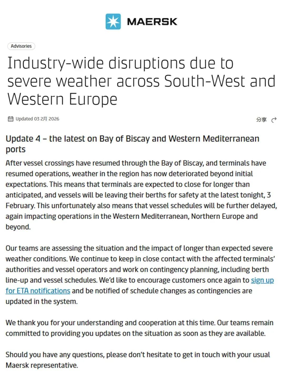 马士基与德迅于当地时间2月3日先后发布紧急更新:受极端寒冷天气及风暴叠加影响,美欧两大主干航线的时效正面临严峻挑战。