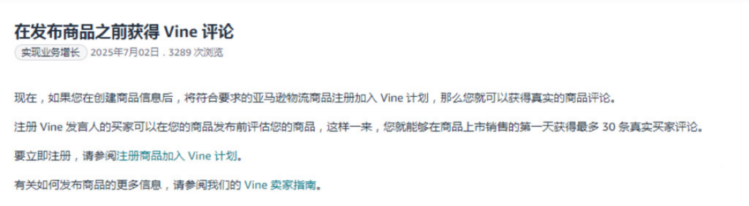 亚马逊最近发布的一则更新,引发了不少卖家关注:只要创建好FBA的Listing,就能提前报名Vine。也就是说,在新品刚上架那一刻,就有机会带着最多30条评论“闪亮登场”。