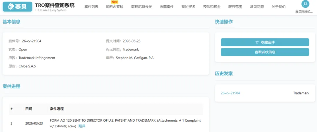 2026年3月23日,法国奢侈品牌Chloe S.A.S.(克洛伊)在美国佛罗里达州南区联邦地区法院发起商标侵权诉讼(案件号:26-cv-21904),委托Stephen M. Gaffigan, P.A.律所维权,指控多名被告通过跨境电商店铺销售假冒、仿冒其商标的服装、箱包、鞋履等产品,涉嫌商标伪造、侵权及不正当竞争。