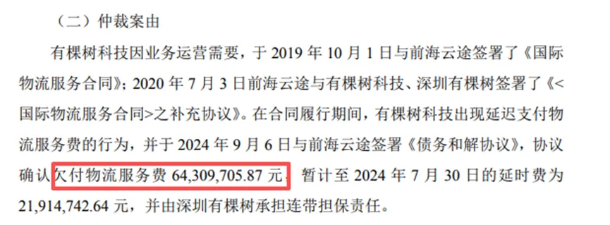 然而在合同履行过程中,有棵树科技始终存在延迟支付物流服务费的情况,直至2024年9月签署《债务和解协议》,才确认欠付物流服务费6430.97万元,暂计至2024年7月30日的延时费达2191.47万元。