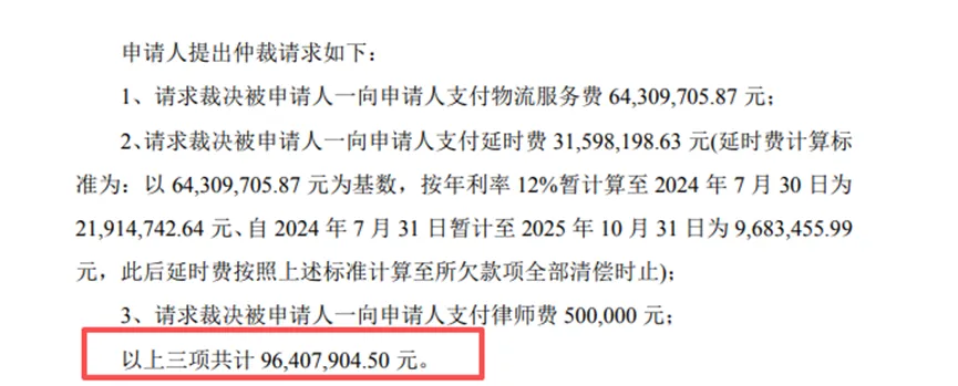 协商未果后,前海云途提起仲裁,除要求支付上述款项外,还主张2024年7月31日至2025年10月31日的延时费968.35万元及50万元律师费,合计索赔9640.79万元。