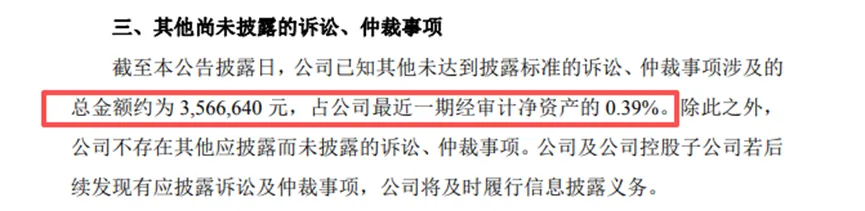 值得注意的是,公司其他未达披露标准的诉讼、仲裁事项涉及金额仍有356.66万元,占最近一期经审计净资产的0.39%。