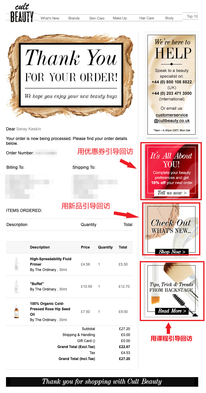 Cult Beauty 的订单确认邮件的设置暗藏玄机。