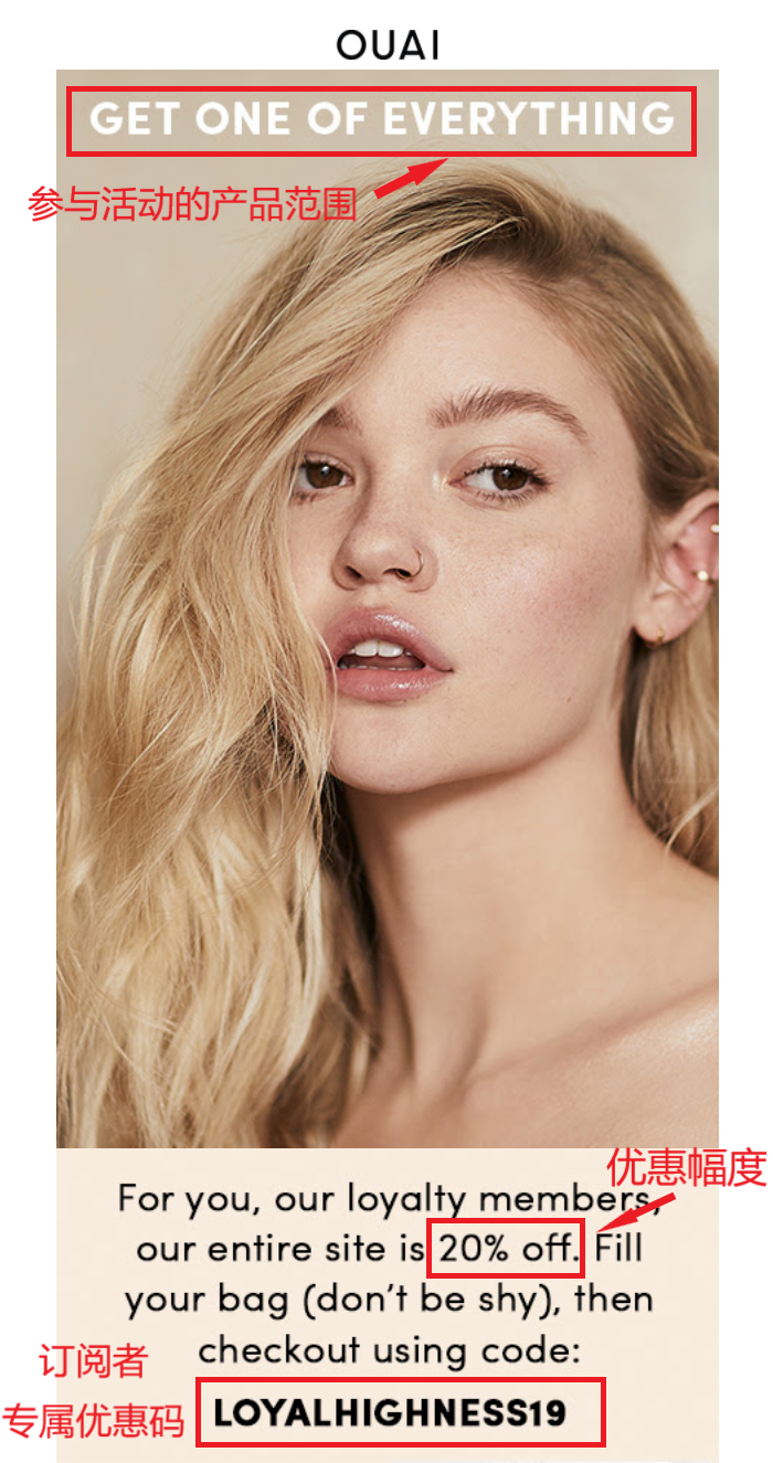 以 OUAI 的促销邮件为例,品牌方不仅露出了参与促销范围和优惠幅度等必要信息,还增置了只有邮箱订阅者才可享受的优惠码。
