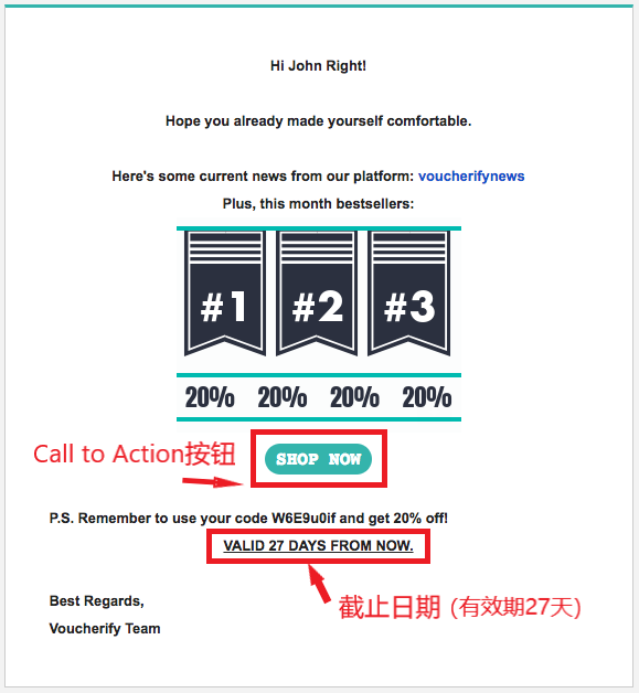 ◆3.留存邮件:此类邮件是根据消费者采取的行动触发的,例如,消费者弃购的动作会触发挽留邮件,消费者注册订阅后会触发欢迎邮件,消费者超过特定时间段未回访会触发回购唤醒。