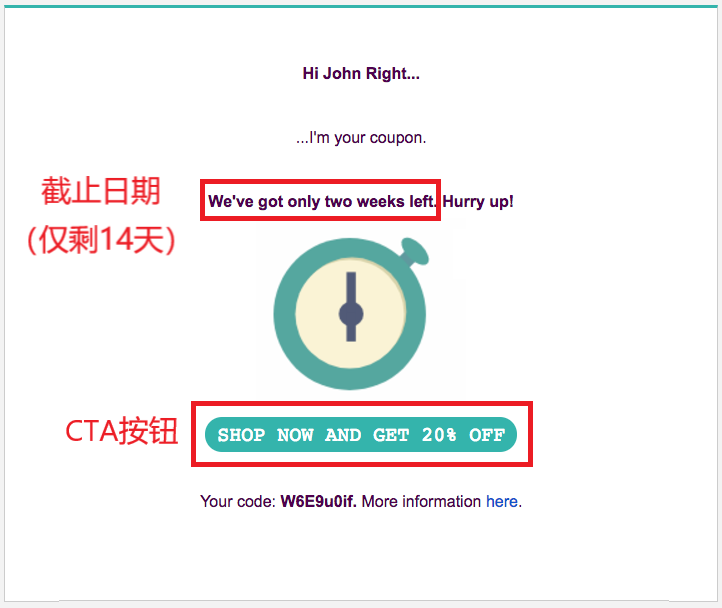 比如上图品牌在优惠发放日(有效期27天)以及优惠截止前14天、截止前24小时分别发送了提醒邮件,不仅能够保证触达率,还能营造紧迫感,促进消费者下单。