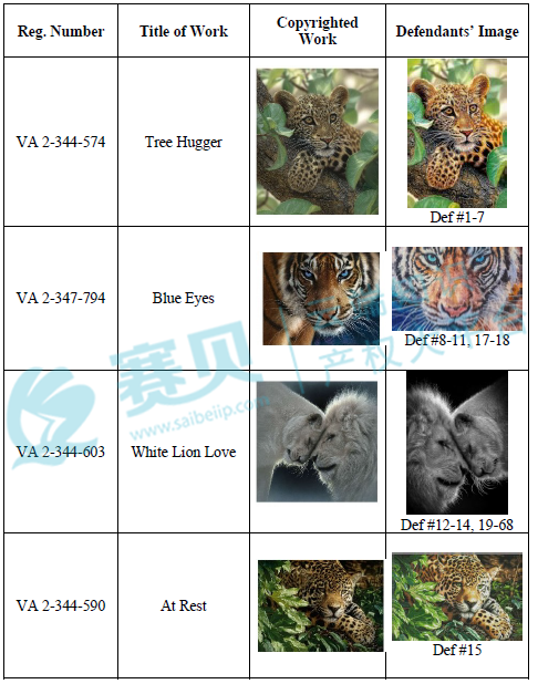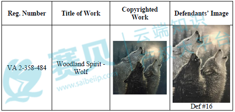 案件涉及多项美国版权注册作品,统称为 “Collin Bogle 作品”,具体包括:VA 2-344-574:《Tree Hugger》、VA 2-347-794:《Blue Eyes》、VA 2-344-603:《White Lion Love》、VA 2-344-590:《At Rest》、VA 2-358-484:《Woodland Spirit - Wolf》等,涵盖白狮、蓝眼虎、花豹幼崽、狼、美洲豹等野生动物题材。赛贝提醒各位跨境卖家,若店铺销售艺术印刷品、装饰画等产品,需核查产品是否使用了以下版权作品,避免触碰侵权红线。