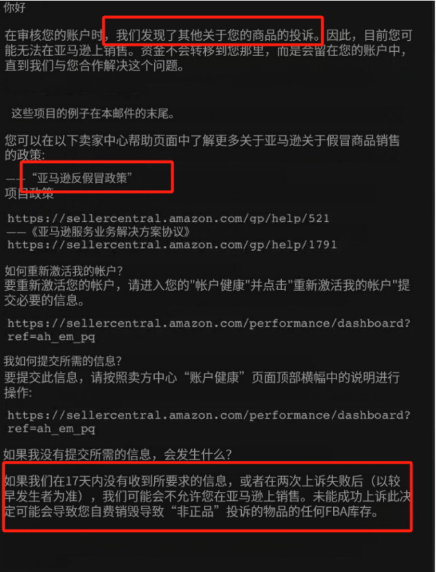 显而易见,这封邮件在某种程度上明确传达了卖家涉嫌“销售假冒商品”的暗示。邮件中的措辞让人产生了怀疑,似乎在暗示卖家的商品可能存在问题,尽管没有直接明言。这样的指控对于卖家来说无疑是一种极大的压力和困扰,尤其是在没有明确证据的情况下,这种暗示容易给卖家带来名誉和销售上的双重损失。