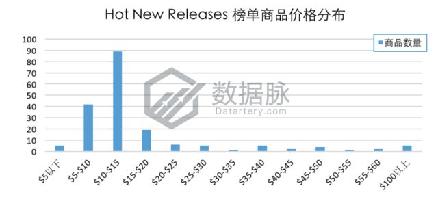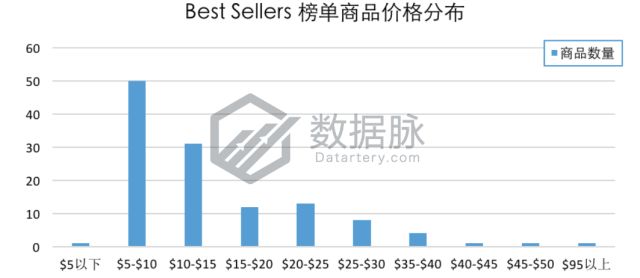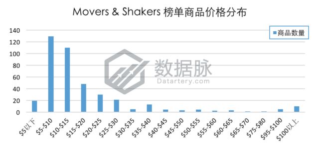 上周Cell Phones & Accessories品类Best Sellers榜单商品最高价$99.99,最低价$3.99,平均价格$14.44。骆探长(shujumai.com)发现,该榜单商品平均价格不变。在上榜的商品中,价格在$5.00-$10.00区间内的商品数量进一步增加,占比达37.88%;有23.48%的商品价格分布在$10.00-$15.00的区间内;另外仅有1款商品超过$95,占比为0.76%。