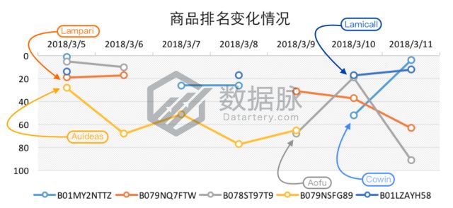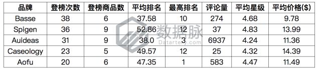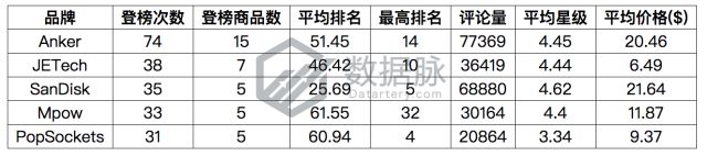 根据上周 Movers & Shakers 榜单上各个品牌下商品的登榜次数,我们对登榜的品牌进行了排序,其中排名靠前的五个品牌如下所示: