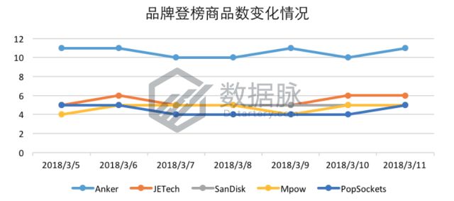 骆探长(shujumai.com)发现,在上周的Best Sellers榜单中,数码电子品牌Anker凭借上周每日登榜至少10款商品,共登榜74次,击败其他品牌,继续保持品牌排名第一的地位;手机保护类品牌JETech每日至少登榜5款商品,共登榜7款商品,累计登榜38次,位列品牌排名第二;内存卡品牌SanDisk凭借每日登榜5款商品,以总登榜35次,位列品牌排名第三;品牌Mpow同样有不俗表现,在上周登榜5款商品,累计登榜33次,位居品牌排名第四;手机支架品牌PopSockets凭借登榜5款商品,以总登榜31次,位居品牌排名第五。