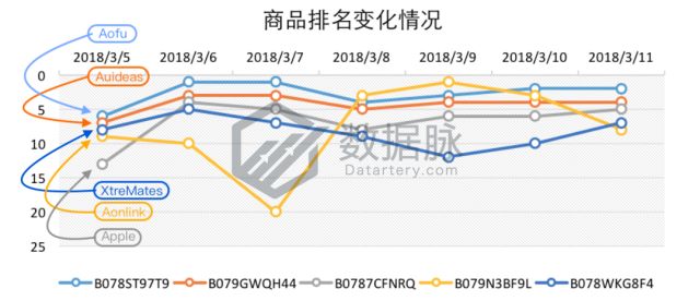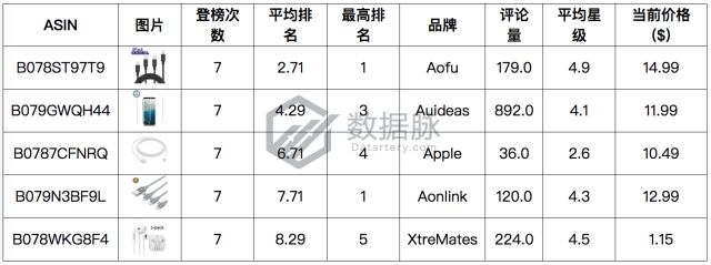 品牌Apple的数据线顶着平均星级2.6星的口碑压力,榜单排名波动上升,以平均排名6.71位列综合排名第三;