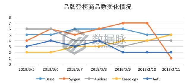 在上周Cell Phones & Accessories品类的Hot New Releases榜单中,手机配件品牌Basse表现出色,每日登榜至少5款商品,共登榜6款商品,凭借登榜38次赢得品牌排名首位;手机配件品牌Spigen登榜9款商品,累计登榜36次,暂居品牌排名第二;品牌Auideas、品牌Caseology、品牌Aofu分别登榜31、23、20次,分别位列品牌综合排名三、四、五位。