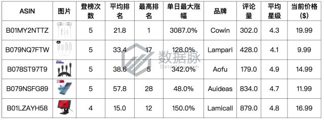 在上周Cell Phones & Accessories品类的Movers & Shakers榜单中,骆探长发现(shujumai.com)发现,仅有综合排名第五的商品登榜4次;品牌Cowin的入耳式耳塞以平均排名21.8位列综合排名首位,单日最大涨幅高达3087.0%;