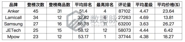 品牌Aonlink的数据线榜单排名波动较大,曾三度进入榜单前三,以平均排名7.71位列综合排名第四;
