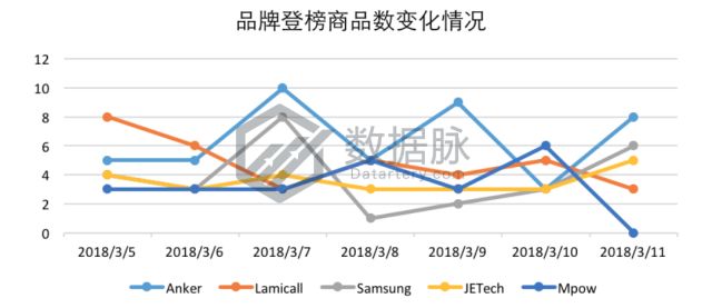 可以看到,在上周Cell Phones & Accessories品类的Movers & Shakers榜单中,骆探长(shujumai.com)发现,品牌竞争激烈,品牌Anker一周内登榜31款商品,特别地,在3月7日登榜了10款商品,共登榜45次的不俗表现,荣膺品牌排名第一;手机支架品牌Lamicall以登榜12款商品,累计登榜34次,位列品牌排名第二;品牌Samsung、品牌JETech、品牌Mpow一周内分别登榜16、15、12款商品,分别登榜27、25、23次,位列品牌排名第三、四、五位。