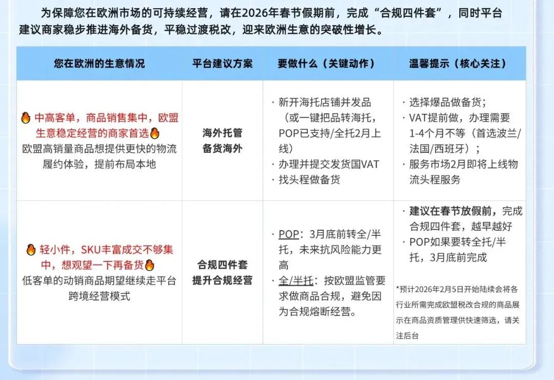 大家都知道,2026年欧洲市场的关税会发生变化,合规要求更加严格。但别担心,跟着平台的要求,“完成合规 + 备货海外”,商家朋友们就能平稳度过税改波动期。