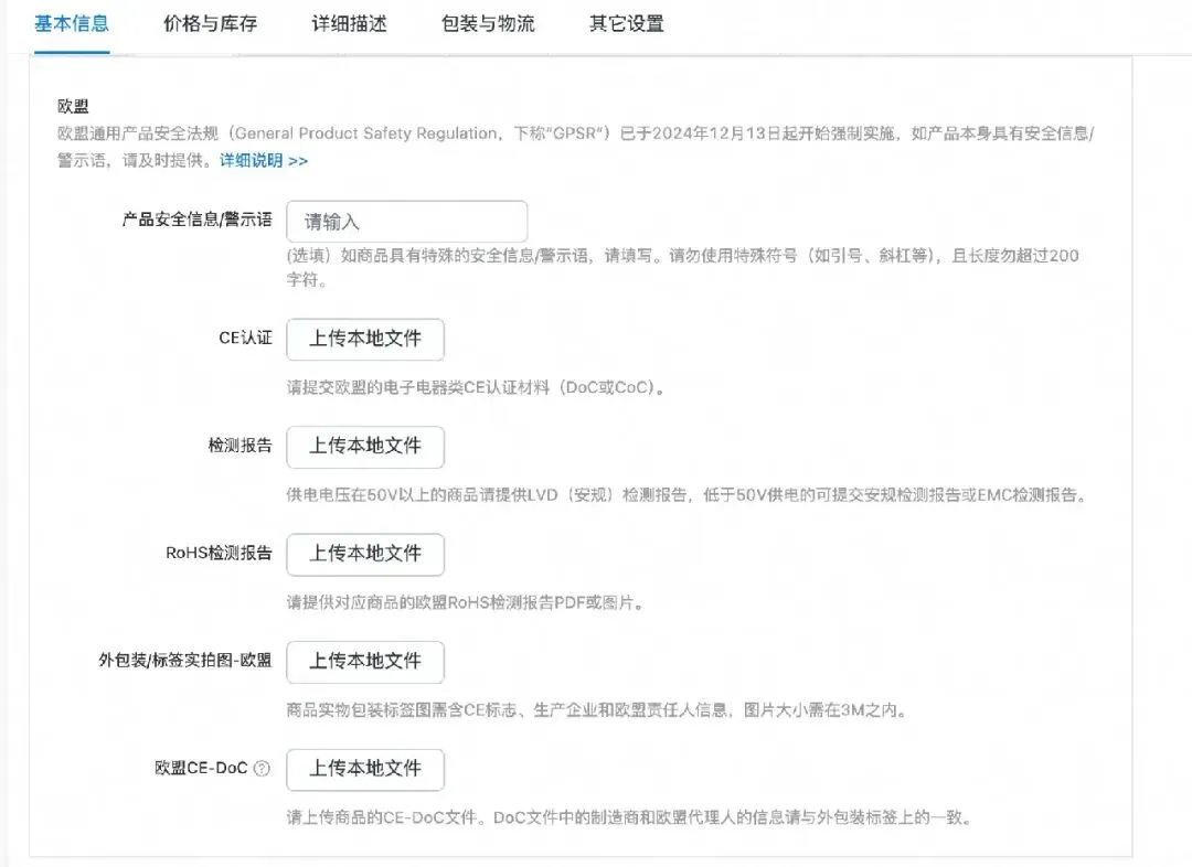 ✰新发商品:系统提示欧盟所需资质均需要完成上传