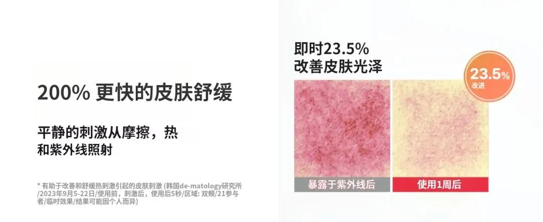 极速舒缓:能200%地舒缓因摩擦、炎热和紫外线照射引起的刺激。测试显示,在使用后5秒内,受热刺激的皮肤泛红即得到显著改善。