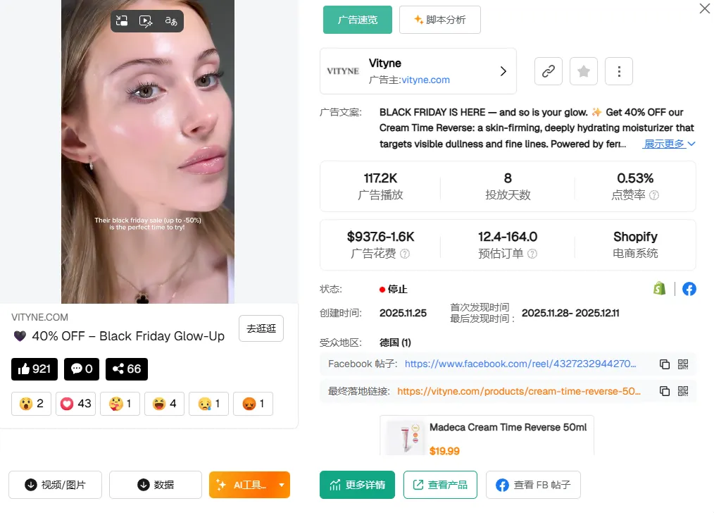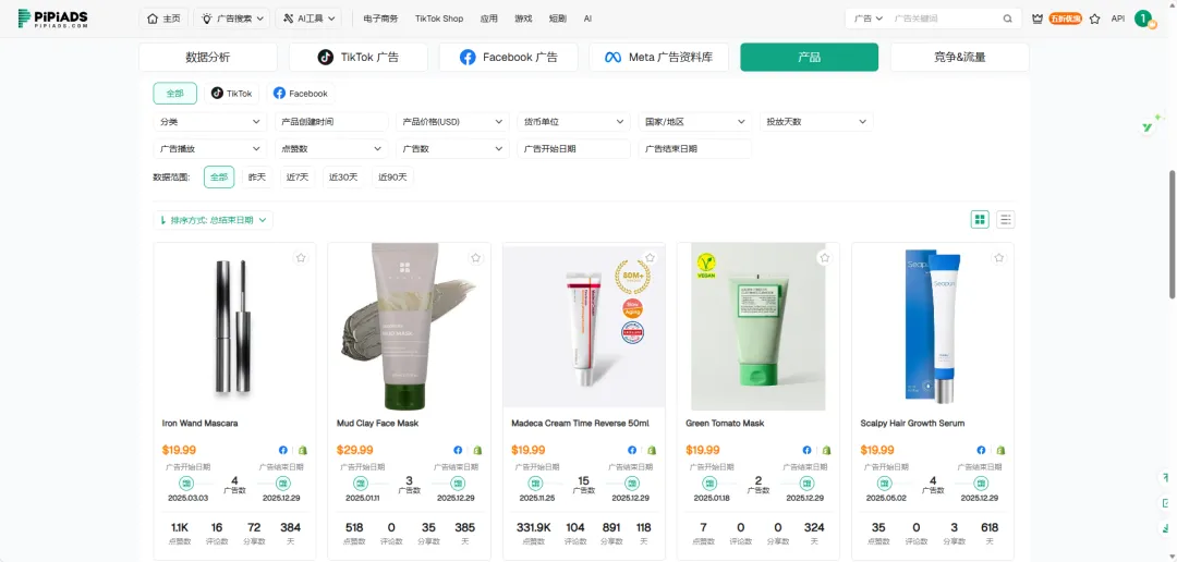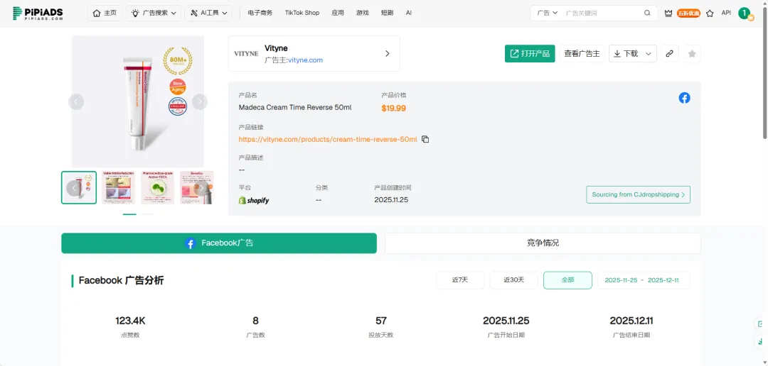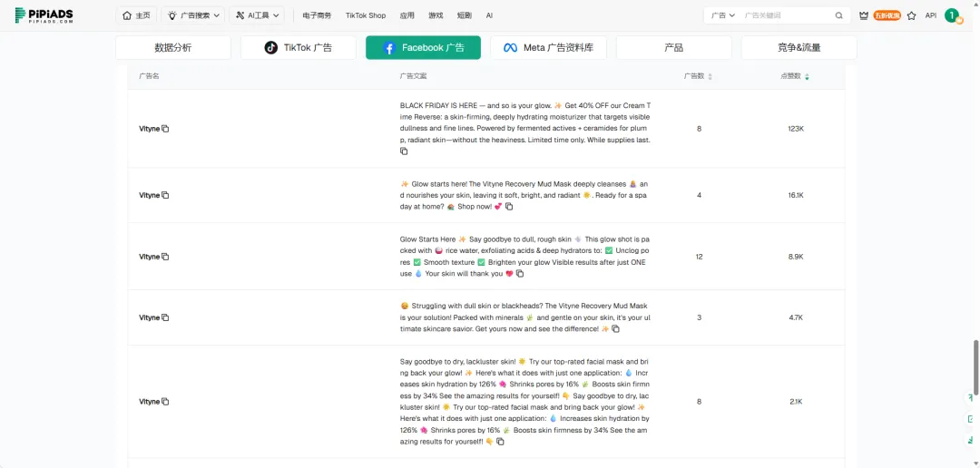 在广告主产品页面,客户还能够看到广告主上架到所有产品,我们可以看到Vityne上架到产品全都是美容护肤类产品,并且能够看到各个产品的具体数据,如定价多少,投放了多少天,点赞数,评论数等。这能够更好的帮您筛选同类产品。