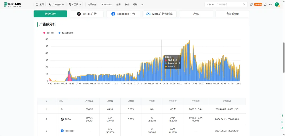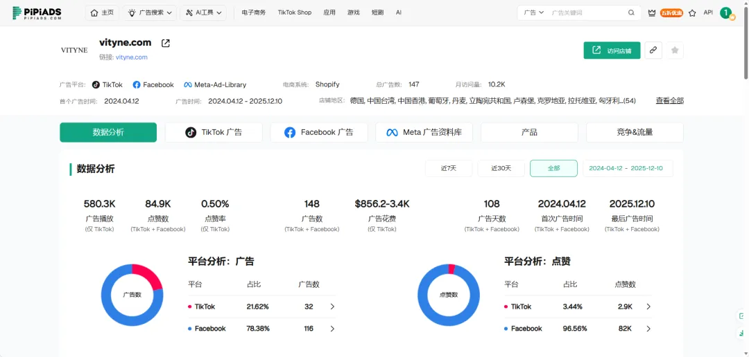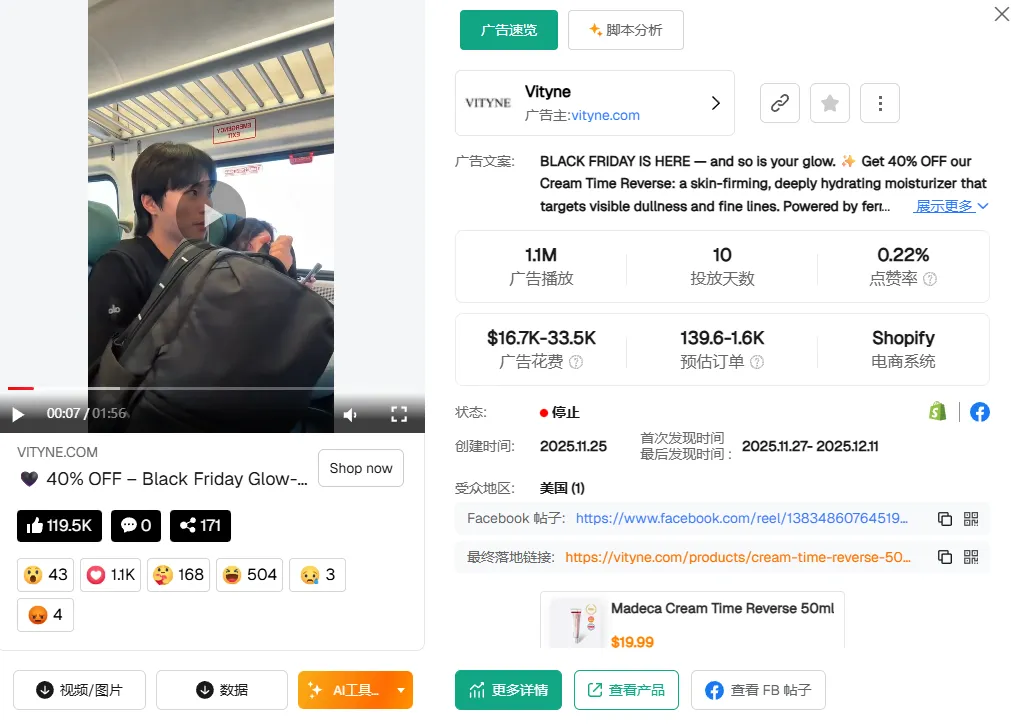 Vityne在2024年4月至2025年12月的投放周期中,虽在TikTok获得580.3K播放量,但82K的真实点赞中有96.56%来自Facebook。这一反差表明:对于需要建立信任和教育用户的美容健康产品,Facebook的深度互动环境更具价值。