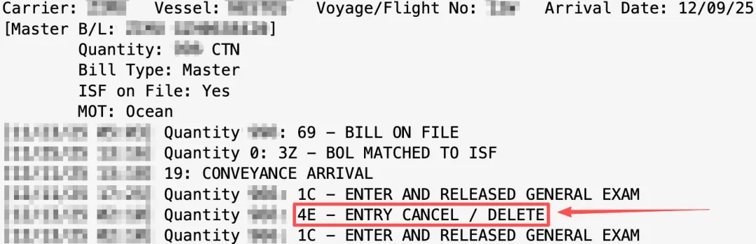 当清关行(Broker)撤销了先前提交的报关单(Entry)时,美国海关 CBP 的 ACE 系统就会返回 4E 状态代码,意味着之前的申报已被撤回(取消原申报),例如当清关行发现申报数据有误,撤销 Entry 申报,对应的货物需要重新提交申报处理,进行清关操作。
