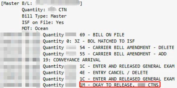 1M 并不直接表示货物放行或查验,而是表示美国海关 CBP 操作后向申报方发送的与某份提单相关的特定消息,可能包含各种说明性、结构性或技术性信息,内容通常在消息体中说明。