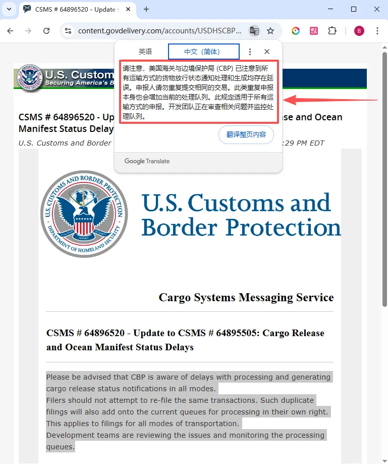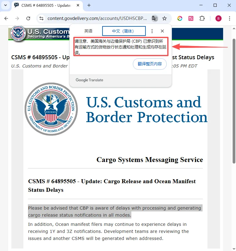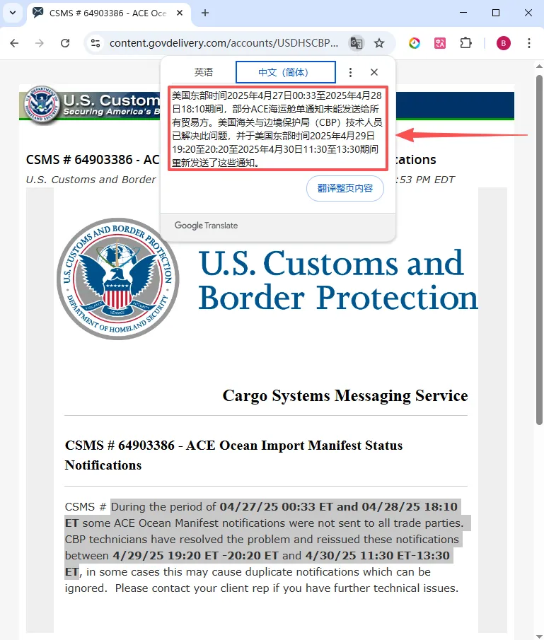 美国海关 CBP 对某份提单(Bill)发送的一条“自由格式消息”FFM(Free Form Message),FFM 是 ACE 系统中允许用户不受固定字段限制,自由输入文本的备注/补充说明/沟通信息。
