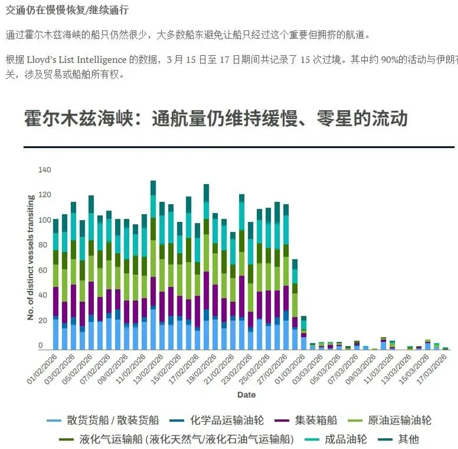 从实际航运数据来看,霍尔木兹海峡近期过境量远低于正常水平,3月中旬仅录得15次过境,且90%都和伊朗直接相关,普通商业航运几乎没有实质性恢复。
