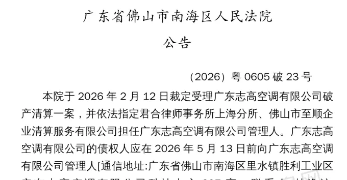 2月,佛山南海区法院正式受理广东志高空调有限公司破产清算申请,正式进入司法破产程序,从披露信息来看,公司已自行申报负债约32亿元。