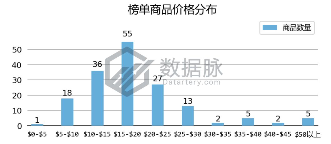 上周 Clothing, Shoes & Jewelry 品类 Hot New Releases 榜单商品最高价$89.99, 最低价$3.29,平均价格$18.04。骆探长(shujumai.com)发现,在上榜的商品中, 其中,定价于$10.00-$20.00价格段的商品数量较多,其中有37.06%商品价格位于$15.00-$20.00价格段,另有28.24%的商品价格位 于$10.00-$15.00价格段。此外骆探长(shujumai.com)发现,上周仅有2款上榜商品的价格超过了$50.00,相比于前几期分析, 该周上榜商品整体平均价格与Best Sellers榜单中的表现类似,同样出现了些许回暖,高价商品在榜单中的竞争力有所增强。