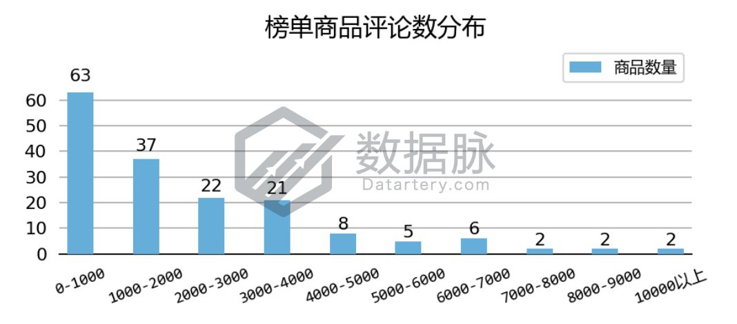 在上周登榜 Clothing, Shoes & Jewelry 品类 Movers & Shakers 榜单的商品中, 单个商品拥有的最大评论数为11328.00条,最小评论数为0.00条,平均评论数1678.98条,评论平均星级4.27星。 骆探长(shujumai.com)注意到,在上榜的商品中,有多达49.07%的商品评论数不超过1000条,另有22.06%的商品评论数在1000条至2000条之间。
