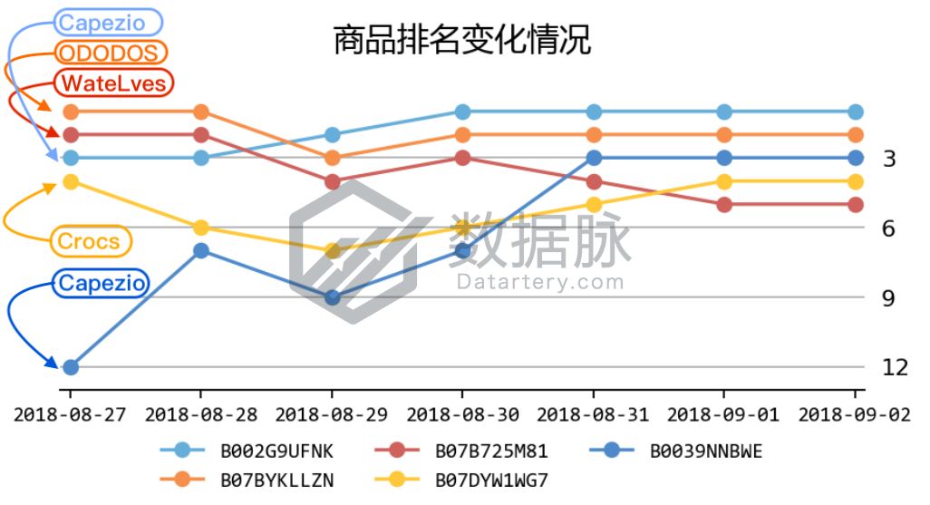 可以看到,在上周Clothing, Shoes & Jewelry品类的Best Seller榜单中, 骆探长(shujumai.com)在上期分析中谈及的潜力产品——儿童舞鞋榜单表现突出。其中,来自品牌Capezio的儿童芭蕾舞鞋在8月30日成功登顶Best Sellers榜单,并在后续的三天中持续蝉联榜首,位列商品综合排名首位;