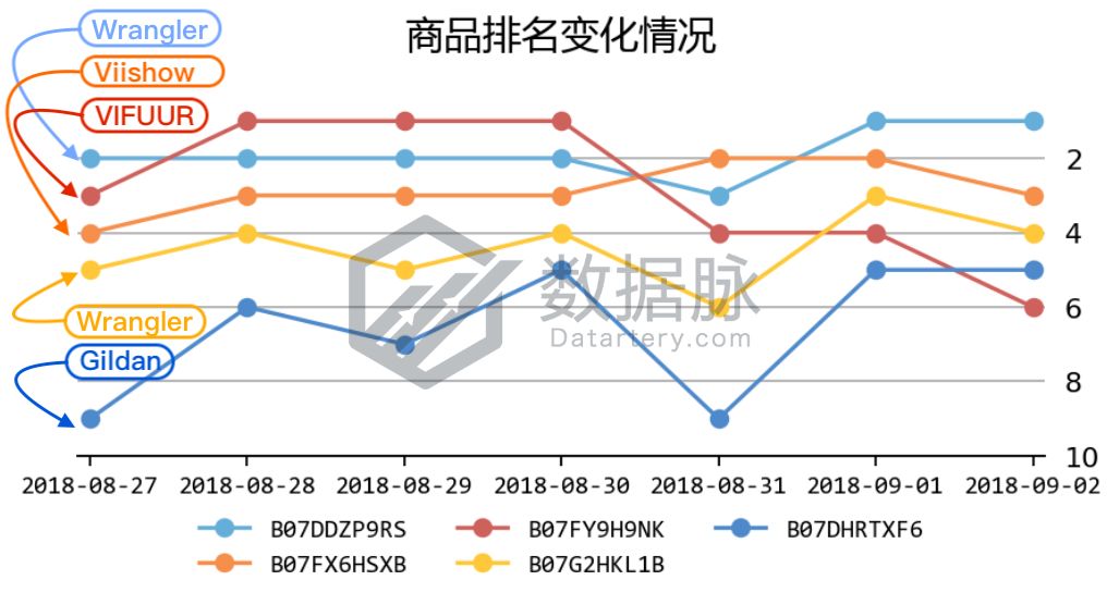 可以看到,在上周Clothing, Shoes & Jewelry品类的Hot New Releases榜单中, 榜单综合表现靠前的五款商品中有两款为来自品牌Wrangler的男士牛仔长裤,其中经典的五袋款式牛仔裤在9月1日之后连续两天蝉联Hot New Releases榜首,而同品牌旗下的一款休闲式牛仔裤也在一周中6次跻身榜单前五,取得了平均排名4.43的不错成绩。