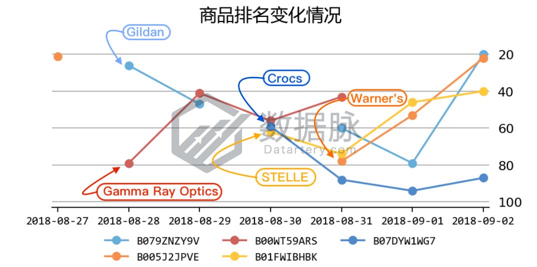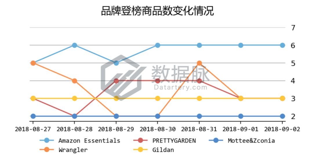 可以看到,在上周Clothing, Shoes & Jewelry品类的Best Seller榜单中, 品牌Hanes凭借9月1日单天进榜6款商品的出色发挥再次拔得头筹,在一周中获得32次等榜次数,位居品牌综合排名首位。于此同时骆探长(shujumai.com)注 意到,儿童芭蕾舞运动用品品牌STELLE在上周的7天中单日进榜商品数稳步上升,并在7天中夺得22次等榜机会,品牌商品的后续市场潜力同样值得关注。
