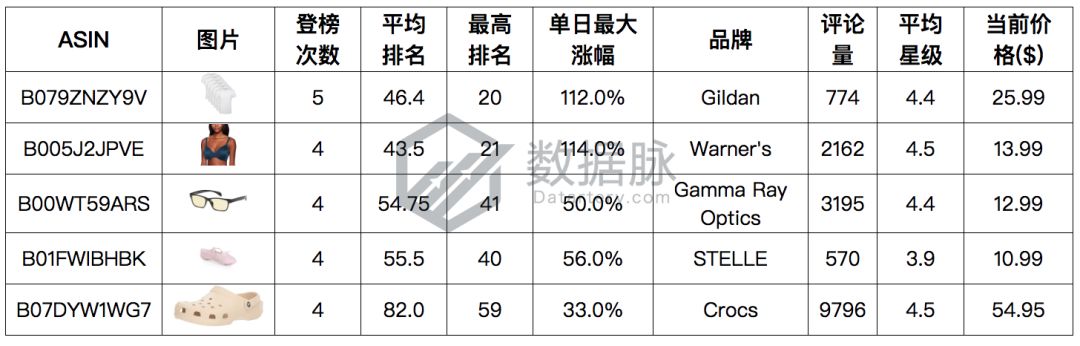 根据上周 Best Seller 榜单上商品的登榜次数及平均排名, 骆探长(shujumai.com)对登榜的商品进行了排序,其中排名靠前的五款商品如下所示: