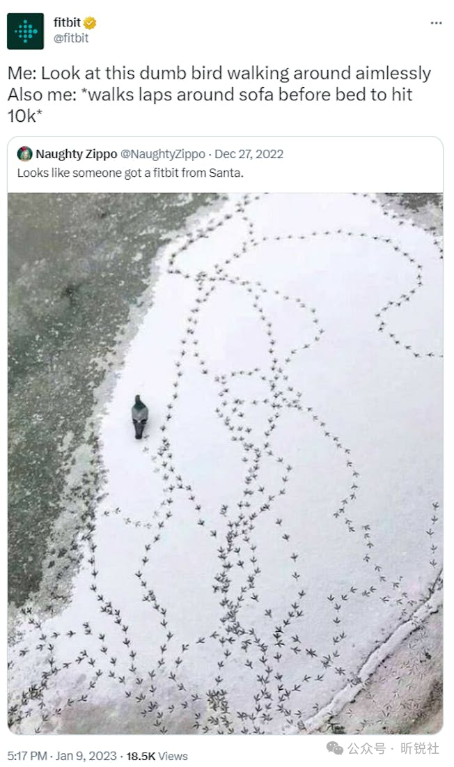 以下推文是Fitbit 对一条推文的回应,该推文展示了一只雪地里的鸟的足迹,这张图片最初获得了22.4k 次浏览量,并配文“看起来有人从圣诞老人那里得到了一个 fitbit”。