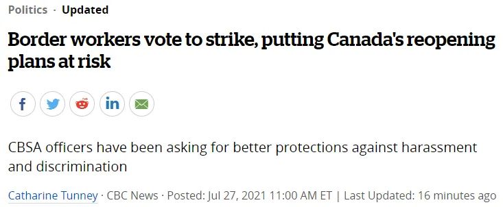 加拿大公共服务联盟(PSAC)和海关移民联盟(CIU)在一份新闻稿中表示,这意味着他们最早可能在8月6日开始罢工运动,也就是加拿大对已接种疫苗的美国人重新开放边境的前几天。在加拿大边境服务局和国库委员会工作的雇员们,已经在无劳务合同的情况下工作了将近3年。