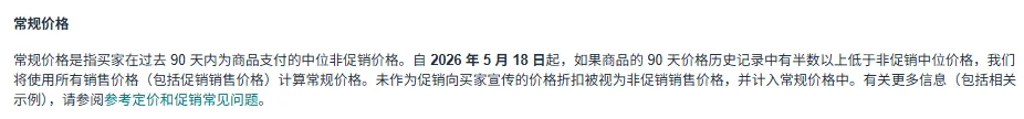 比如你的产品过去90天里有50天都以$20的促销价销售。按照旧规,常规价可能仍是$30。但按新规,由于超过一半时间实际售价低于$30,系统会认为$20才是其“常规状态”,从而将常规价计算为$20。
