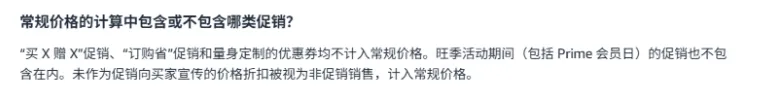 亚马逊官方解释是:“买X赠X”促销、“订购省”促销和量身定制的优惠券均不计入常规价格。旺季活动期间(包括Prime会员日)的促销也不包含在内。未作为促销向买家宣传的价格折扣被视为非促销销售,计入常规价格。