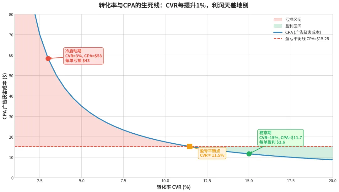 •如果转化率达到15% 呢? CPA 将大幅降至 $11.67,项目瞬间扭亏为盈。